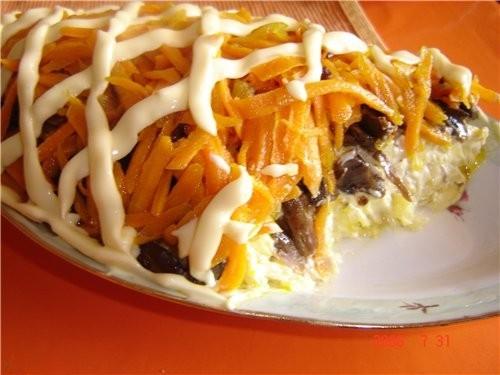 - Выложить слоями: картофель - мясо - грибы с луком - морковь. Прослоить всё майонезом в виде сеточки из корнетика или пакета с дырочкой.