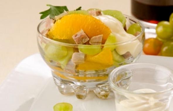 - Для соуса майонез взбейте с сахаром, лимонным соком и перцем. Перед подачей ягоды и фрукты перемешайте с мякотью утки, выложите в салатник и полейте приготовленным соусом. Оформите салат дольками апельсина, ломтиками киви, ягодами винограда и листиками петрушки.